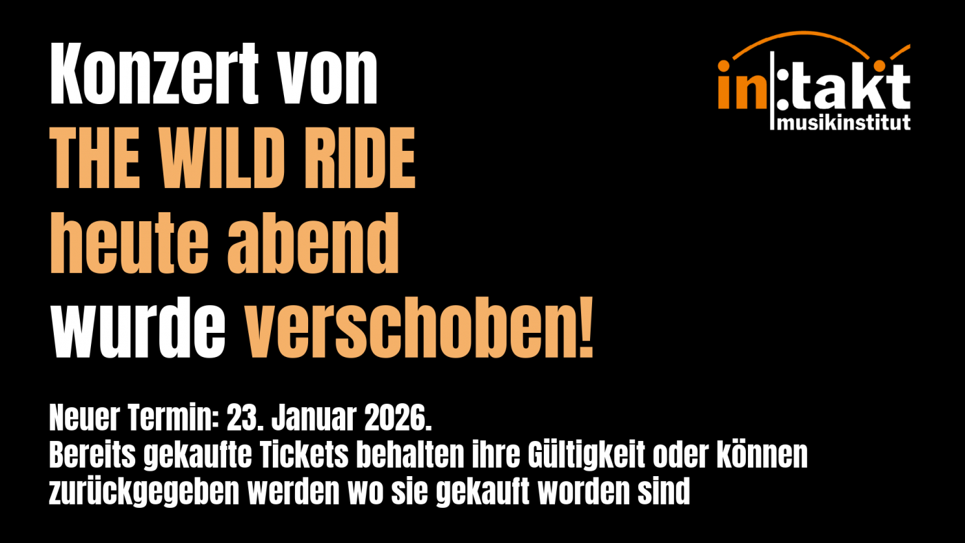 Das Konzert von The Wild Ride heute abend muss leider kurzfristig entfallen. Gottseidank haben wir einen Nachholtermin gefunden: 23. Januar 2026. Bereits gekaufte Tickets behalten ihre Gültigkeit oder können dort zurückgegeben werden, wo sie gekauft worden sind.